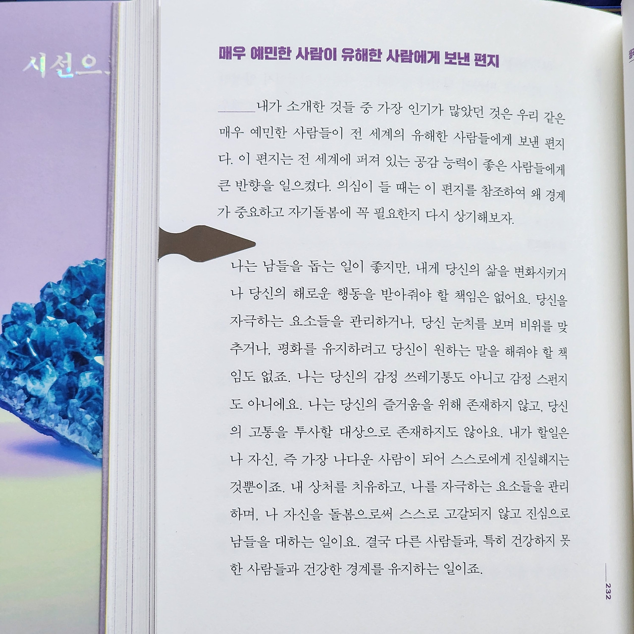 2. 이 책에서 설명하는 것처럼 내가 매우 예민한 사람, 이른바 ‘초민감자empath’에 해당되는지는 모르겠지만(이 책의 42쪽부터 44쪽에 걸쳐 매우 예민한 사람 체크리스트가 있으니 궁금한 사람은 해당 쪽수를 찾아보기 바란다) 초민감자가 아니더라도 유해한 관계로부터 나를 지키는 법은 알아두면 좋지 않을까 하는 마음에 이 책을 읽어보자고 마음먹었다.