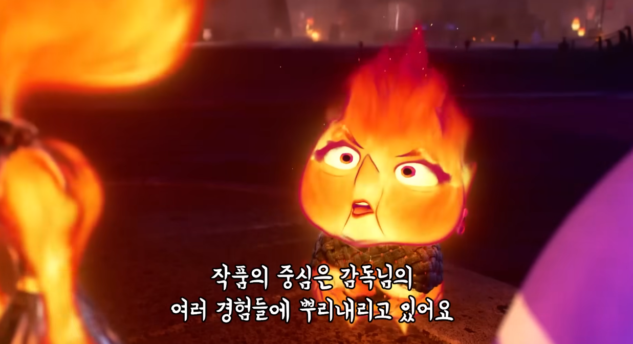 이처럼 픽사의 감독은 자신의 이야기를 영화에 투영하고는 한다. 이는 개인적이면서도 보편적이어서, 우리 마음에 큰 울림을 준다. <엘리멘탈>은 표면적으로 4원소를 CG로 표현한 기술적 의미가 있으면서도 그 의미는 결국, 피터 손 감독의 이야기를 표현하기 위한 수단에 지나지 않는다. 픽사를 대표하는 철학인 "Art challenges technology, technology inspires the art"의 말이 이에 더 잘 맞지 않을 수 없다.