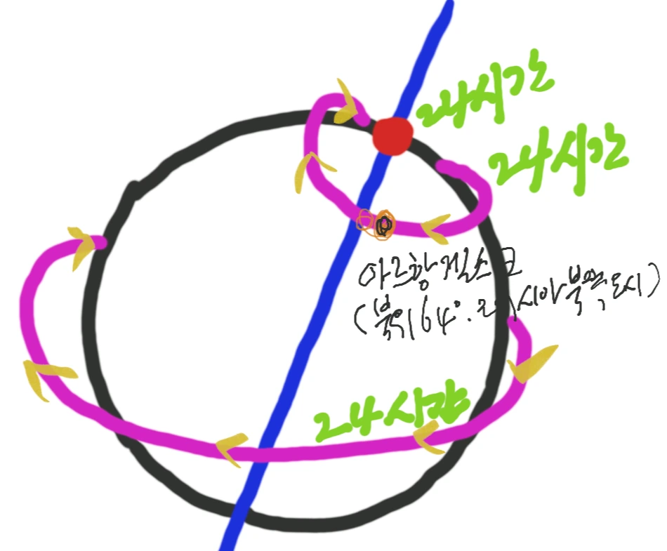 * (해설 1) 시간은 공전 및 자전과 관계된다. 은유적으로는 시침은 공전과 분침은 자전과 관련된다. 위 그림을 보듯이 적도에서의 24시간과 북극 가까운 곳에서의 24시간, 그리고 북극점에서의 24시간은 그 흐름이 다르다. 그래서 "이곳의 시간은 얼마나 더디게 가는지" 라면서, 느리게 흐르는 시간을 사방의 움직임이 정지된 눈과 얼음 탓으로 돌리고 있다. 북극점에서는 시간의 한 축이 흐르지 않게 될 것이다. 누군가가 그곳에 있다면 시간은 흐르지 않는데, 날자는 가고 있는 상황도 경험을 하게 되지 않을까 싶다. 북극에 가까울수록 늦게 흐르는 시간 때문에 '지루함'을 많이 느낄 것 같다.