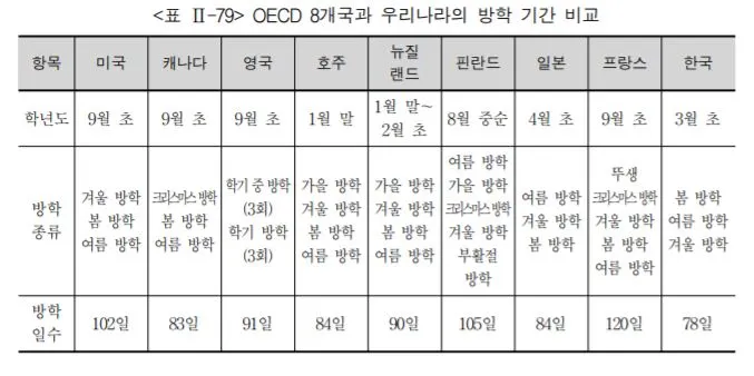교육부의 2013년 보고서를 보면, 한국 학교의 방학일수는 약 78일. 이것도 초·중·고등학교 1개씩 샘플로 조사한 것이니 이보다 더 적은 곳도 부지기수일 터이다. 교육당국은 주5일제 때문이라고 변명하지만, 마찬가지로 주5일제인 다른 나라들과 비교해 보면 별 설득력이 없다. 같은 보고서에도 프랑스 방학일수가 120일, 미국이 102일, 영국이 91일이다. 공휴일 수 등이 다를 수 있겠지만, 그래도 너무 차이가 난다. 자료들을 살펴보면 한국 초·중·고 학교들은 전 세계적으로 비교해 봤을 때 방학일수는 적고 수업일수는 많은 편이라고 해도 될 것이다.