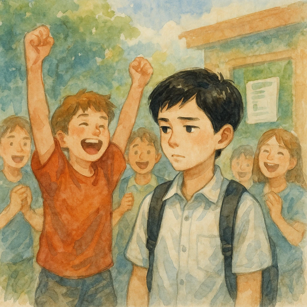 민석은 게시판 앞에 서서 종이를 뚫어져라 보다가, 갑자기 뒤로 세 걸음 물러나 제자리에서 두 번 점프했다. 무릎 각도는 70도 안팎. 착지 시 운동화 밑창이 바닥을 두 번 때리며 둔탁한 소리를 냈다—퍽, 퍽. 그와 동시에 둘러싼 아이들의 손바닥이 서로를 때렸다. 박수의 평균 주기는 약 0.31초. 간헐적으로 비명에 가까운 고음이 끼어들었다. 톤은 높고, 의미는 없다. 의미가 없어도 사람들은 소리를 낸다.