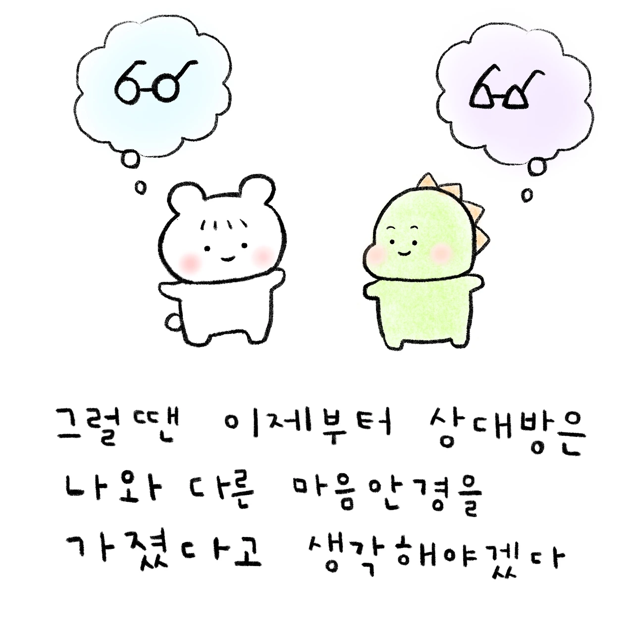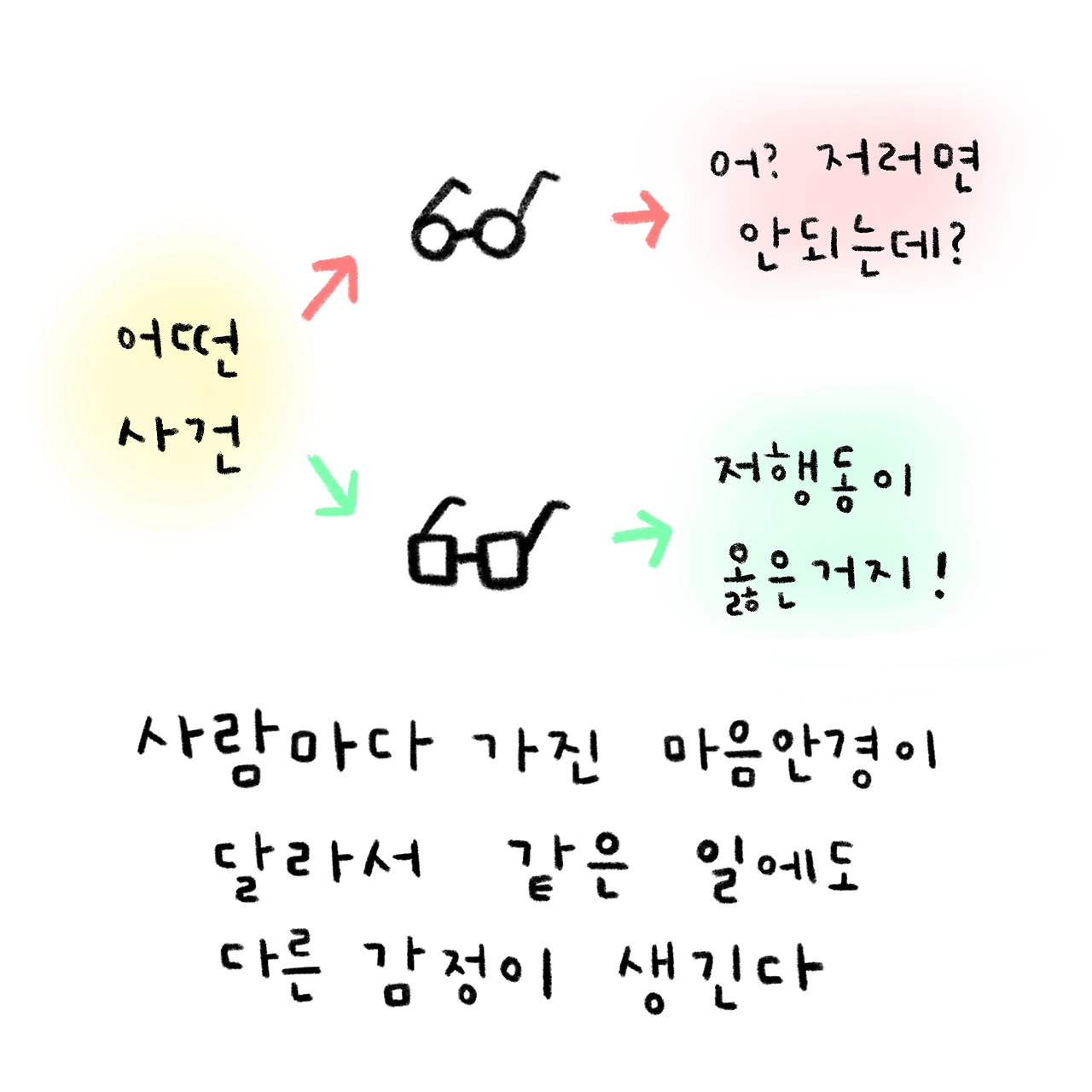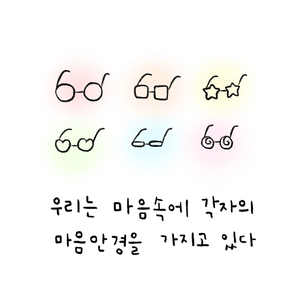 얼마전에 책을 읽었는데 거기서 마음안경이라는 주제로 이야기가 나와서 신선하다고 생각했어요! 그 책을 읽고 제가 마음안경에 대해서 느낀점을 만화로 그려보았어요 :)
