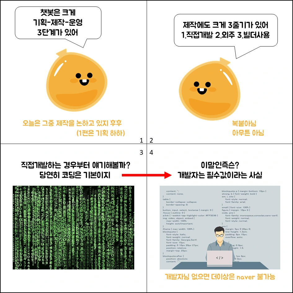챗봇은 크게 기획-제작-운영 3단계가 있습니다. 지난 1편에선 기획을 다루었고 오늘 2편에서는 제작을 다룹니다.