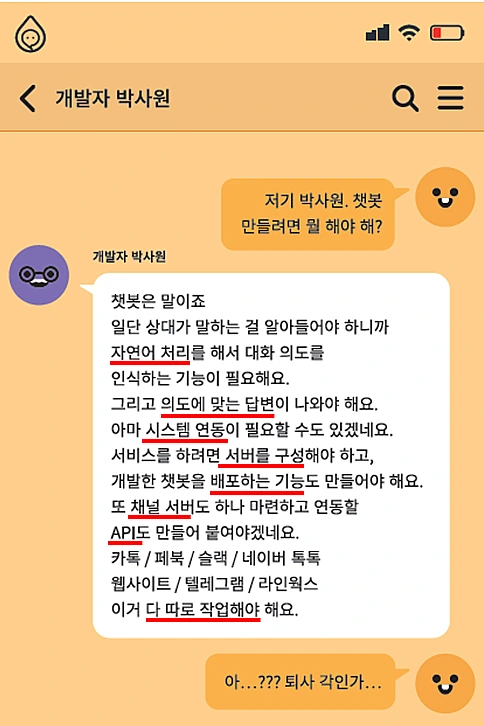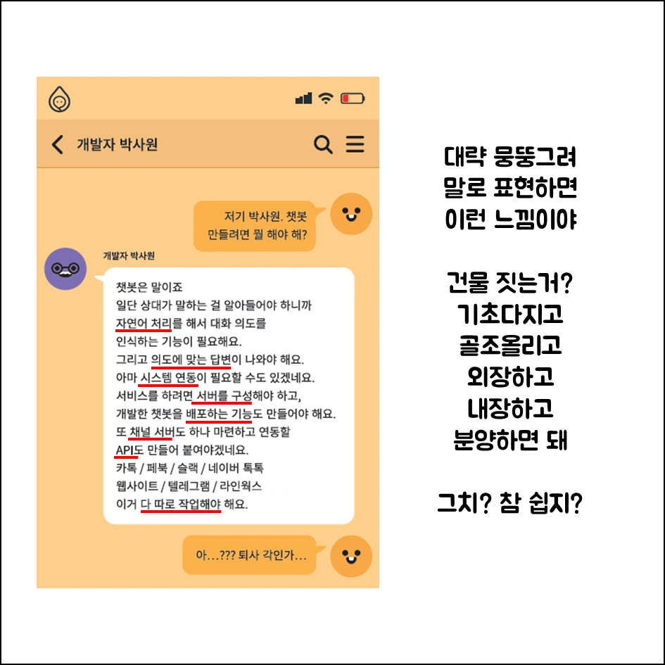 참 쉽죠? 마찬가지로 챗봇도 그렇게 개발하면 됩니다. 그렇습니다. 말이 쉽지 하나하나 많은 피땀눈물이 모여야 하는 작업일 것입니다.