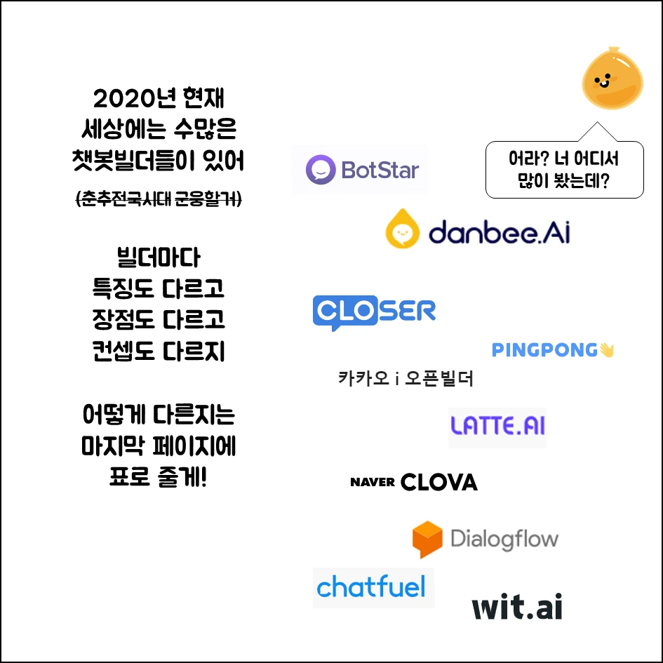 3. 빌더사용 입니다. DIY방식입니다. (Do It Yourself) 이케아를 생각해봅시다. 2020년 현재 세상에는 수많은 챗봇빌더들이 있습니다. (춘추전국시대랄까요. 삼국지 시나리오로 치면 군웅할거) 빌더마다 특징도 다르고 장점도 다르코 컨셉도 다릅니다. 그 중에 적합한 녀석을 찾아 쓰시면 됩니다.