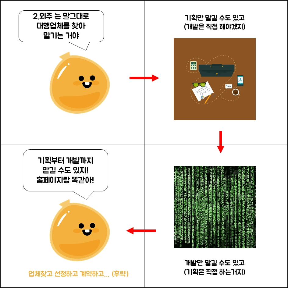 2. 외주는 말그대로 대행업체를 찾아 맡기는 것입니다. 기획만 맡길 수도 있고 (개발은 직접 해야겠죠?) 개발만 맡길 수도 있습니다. (기획을 직접 해야겠죠) 개발부터 기획까지 통째로 맡길 수도 있습니다. 홈페이지랑 똑같습니다. 업체 찾고 선정하고 계약하고... (후략)