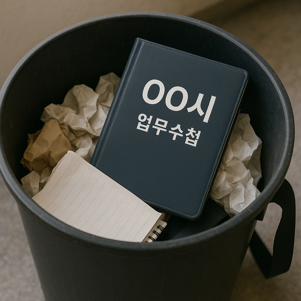 쓰레기들 사이, 버려진 'OO시'라고 큼지막하게 적힌 업무수첩.