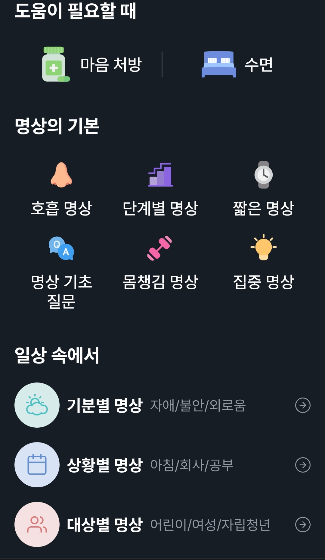 2, 기분별·상황별 카테고리. 그날의 나에게 맞는 명상을 고를 수 있다.