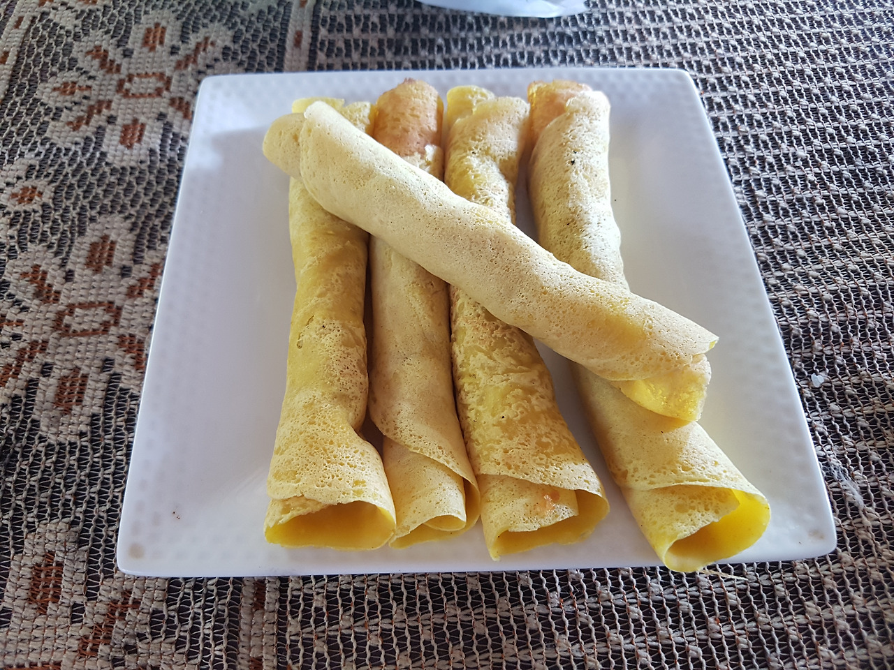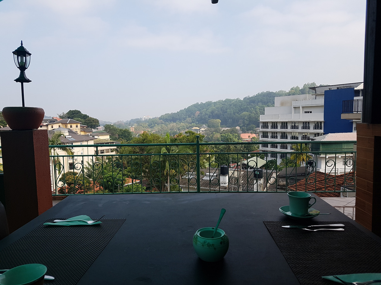 캔디 숙소는 내가 묵은 곳 중에 가장 좋았다. 조식을 먹는 옥상에 마련되어 있었는데 전망이 아주 좋았고 주인께서 직접 토스트와 오믈렛 등등을 해서 주셨다. 홍차도 맛있게 마셨다. 아래에 계란말이처럼 보이는 음식은 스리랑카에서 자주 먹는 아침인 것 같았다. 밀가루로 만든 피 안에 갈색 설탕인듯한 단 것들을 넣어서 먹는 음식이었다. 정말 맛있었고 달아서 많이 먹기는 힘들었다.