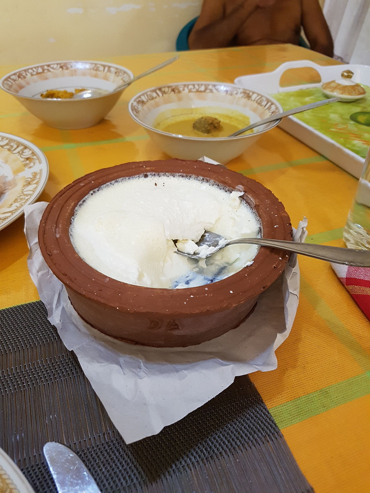집에서 만들었다는 요거트 같은 음식 그 뒤로 보이는 생선카레요리, 그 뒤엔 카레를 묻힌 콩으로 기억한다.