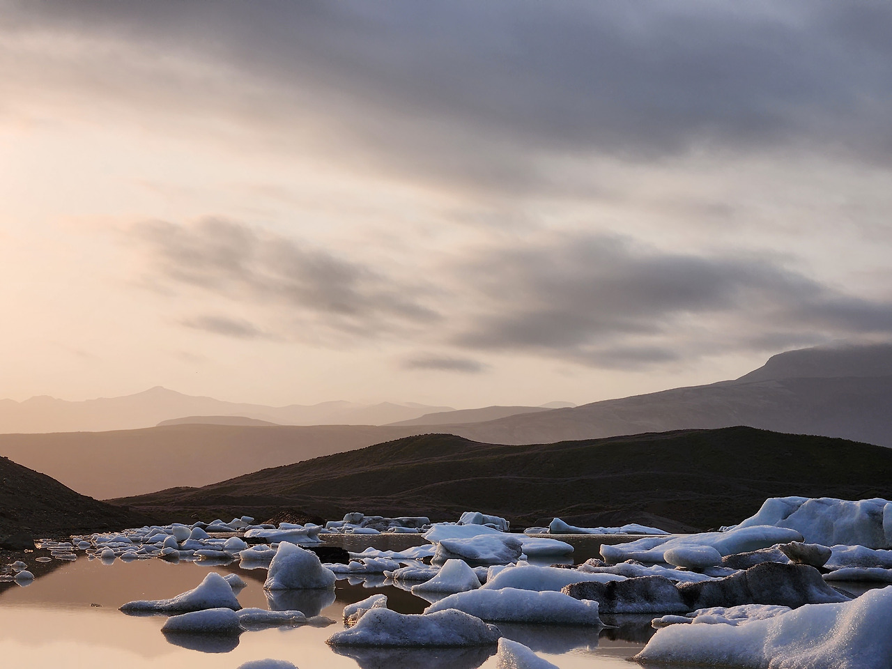 노을 빛이 살짝 입혀지고, 발소리 외에는 아무 소리도 없는 곳에서 아무런 방해도 받지 않고 오랫동안 빙하를 보았습니다. 해가 지지 않는 백야에는 이렇게 시간과 날씨에 구애받지 않고 하고 싶은 걸 할 수 있는 것이 가장 큰 축복이었습니다.
