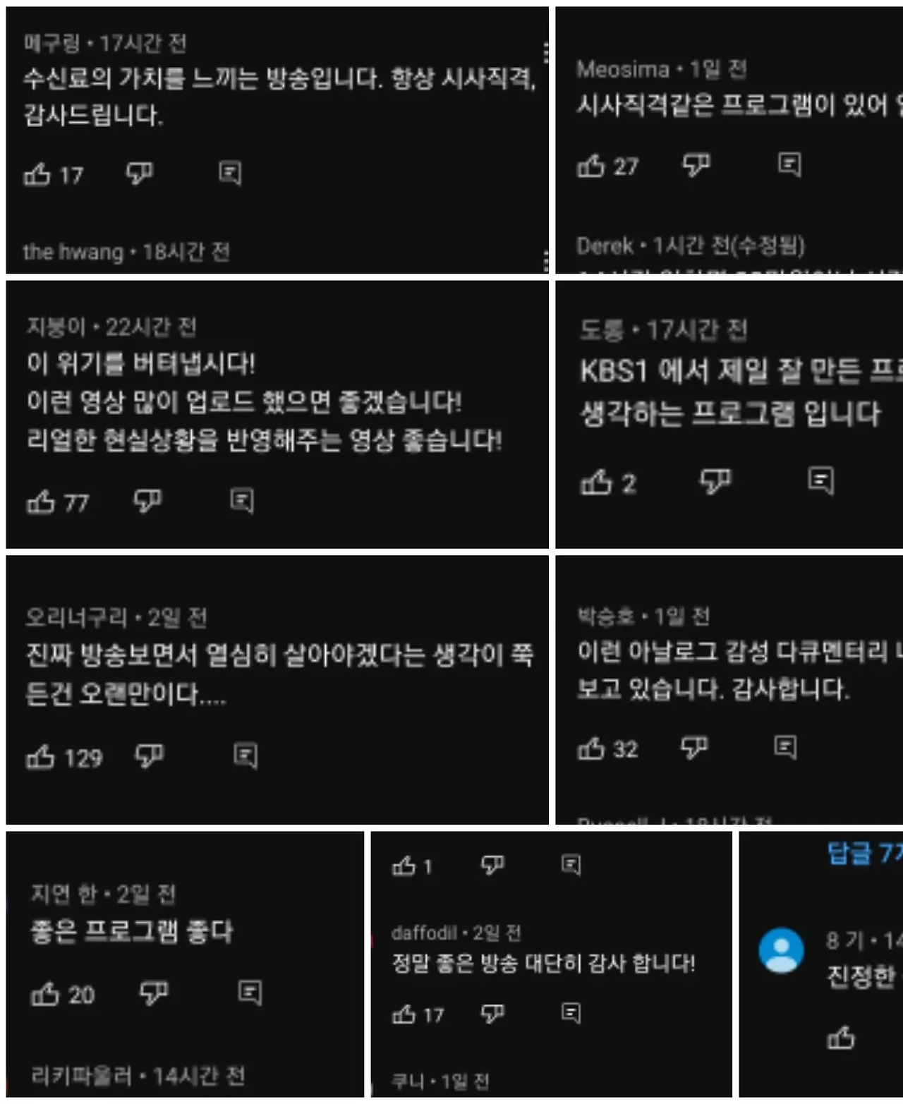 그리고, 출연자들을 응원하는 댓글과 프로그램에 대한 호평 댓글을