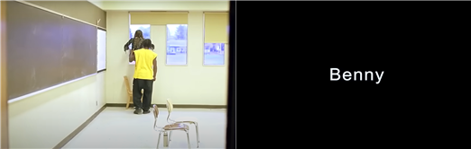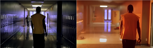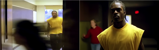 이번 장면 분석은 바로 이 충격의 시퀀스에 나오는 씬이다. 노란 나시를 입은 흑인 학생 ‘배니’ 등장 씬이다. 앞서 말했던 것처럼 롱테이크이고 인물을 카메라가 쫓아가고 있다. 이 장면에서 나는 고전 할리우드의 관습처럼 느껴질 수 있는 부분들을 발견했고 나 역시 영화를 보며 내가 예상한 대로 흘러가진 않을까 궁금해했다. 결론부터 이야기하면 구스 반 산트는 그렇게 만만한 감독이 아니었다. 오히려 익숙한 구도를 아무렇지 않게 파괴하며 관객에서 낯설음을 주고 이 낯설음을 통해 관객이 자신이 기대한 바가 현실과 얼마나 동떨어져 있던 것이었는지 성찰할 수 있는 계기를 준다. 관련된 내용은 장면을 분석하며 더 자세하게 다루도록 하겠다. 배니 씬이 하나로 이어져 있지 않기 때문에 총 2개의 장면을 볼 것이다. 하나는 영화 러닝타임상 1시간 8분 48초부터 1시간 10분 32초까지 총 1분 44초 동안 이어지는 장면이고 다른 하나는 1시간 11분 45초부터 1시간 12분 35초까지 50초 동안 이어지는 장면이다. 연이어 살펴보도록 하겠다.