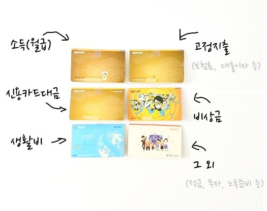 ④ 생활비 통장 : 생활비를 넣어두는 통장. 평소 생활하면서 지출할 때 쓰는 돈으로 체크카드가 연결되어 있다.