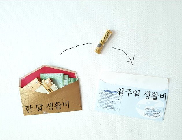 ② '한 달 생활비' 봉투에 한 달 생활비를 넣어놓고, 거기서 일주일 생활비를 꺼내 B 봉투에 넣는다.