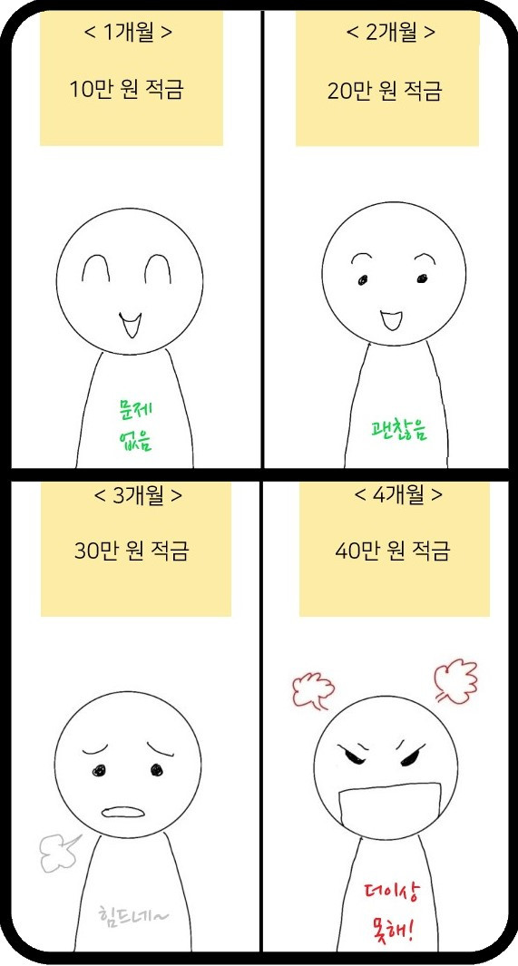 쉬운 이해를 돕기 위해 10%를 10만 원이라고 했다. 적금 액수를 늘리다 보면 4개월 차 그림처럼 생활비가 쪼들려 폭발하는 순간이 온다. 그게 내가 감당 가능한 최대치인거다.