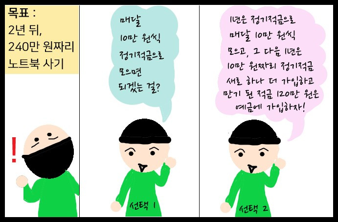 2년 이상 목돈을 모을 때 그렇게 길지 않은 기간이라며 다른 상품은 생각하지 않고 계속 적금만 이용하는 경우, 좀 다른 방법을 생각해 볼 필요가 있다. 예를 들면, 2년 뒤에 최신 노트북을 사겠다며 적금으로만 돈을 모으는 것보다는 일단 1년만 적금을 가입하고~ 1년이 지나면 적금 만기 된 건 예금에 새로 가입하는 동시에 아직 더 모아야 하는 돈은 다시 1년 적금으로 가입해서 준비하는식으로 말이다.