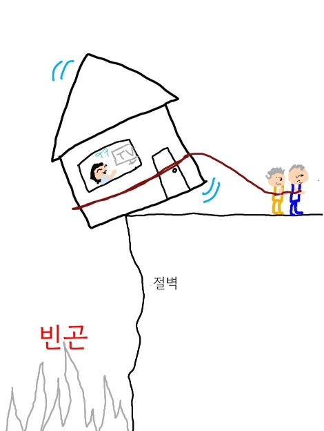 하지만 실상 집은 절벽 끝에 집에 반쯤 걸 터져 있었고 그런 집을 빈곤이라는 그 절벽으로 떨어지지 않게 붙들고 있었던 건 다름 아닌 늙고 쇠약해지신 부모님이셨다. 만약, 한 분이라도 그 끈을 놓아버리면 집이 절벽 아래로 추락할 판인데도 나는 아무것도 모른 체 덜렁거리는 집 안에서 아무것도 모르고 소파에 누워 TV나 처 보면서 “이 정도면 행복하지~”하며 살았다. 이미 가난이라는 불행에 두 발이 닿은 것도 모르고.