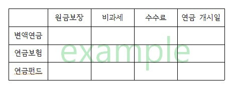 그럴 때는 아래 그림 같이 종이에 변액연금, 연금저축 등 원하는 상품을 차례로 써놓고 가입 기간, 혜택, 운영방식 등에 그 차이에 대해 표로 간단히 적는 게 가장 알기 쉬운 방법이다. 눈으로 보기 쉽게 정리해놓고 “아~ 이런 차이가 있구나~”라는 생각으로 접근하면 뭐가 뭔지 모르겠다는 식에 거부감이 많이 사라진다.