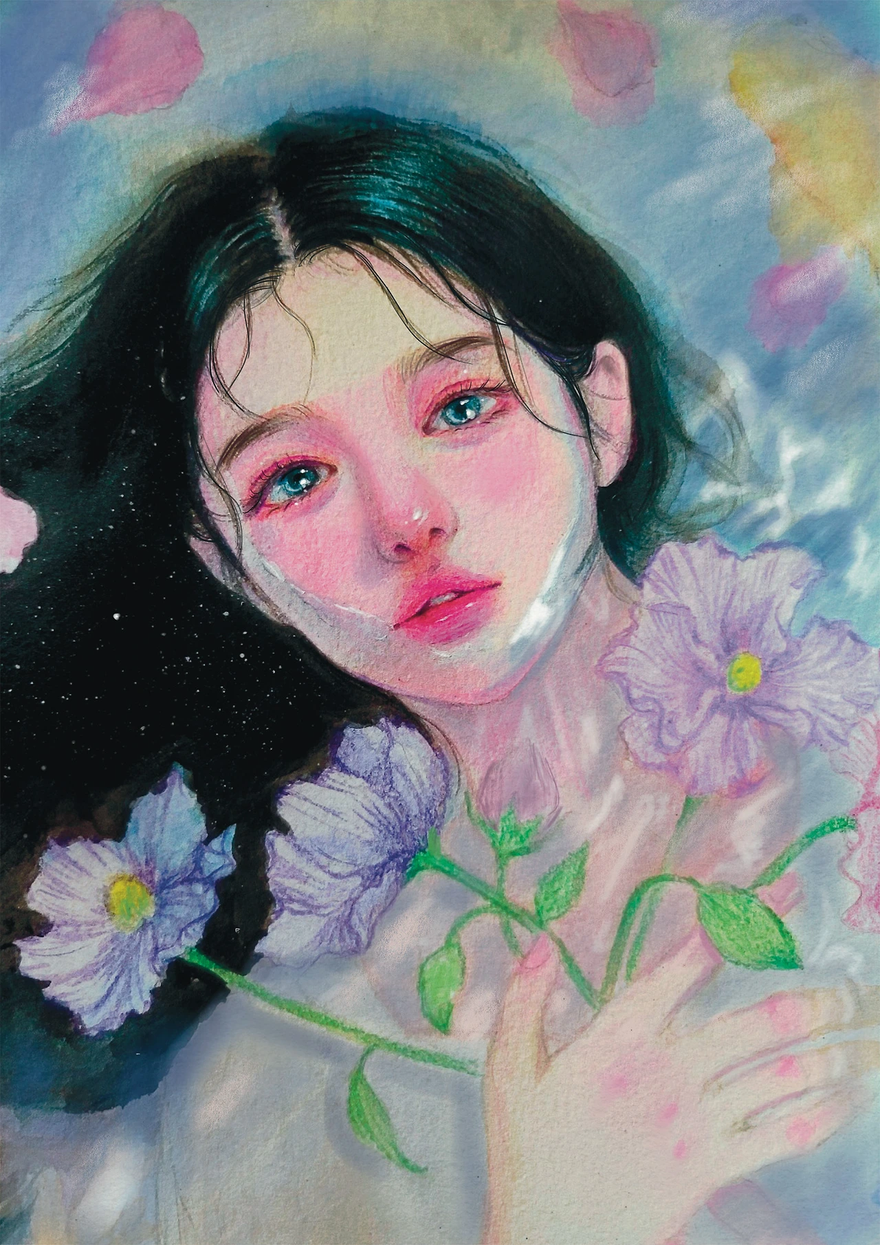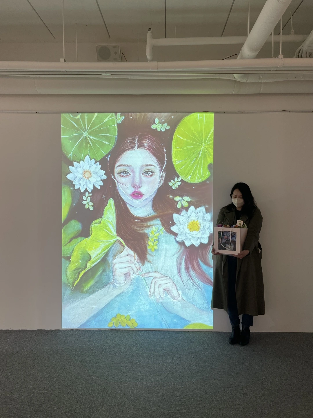 물에는 양면성이 있다고 생각한다. 생명이 태어나기도 하고 생명을 빼앗기기도 한다. 그런 두 가지 측면을 가진 물이라는 매개체가 흥미롭게 느껴졌다. 그때 밀레이의 오필리아를 보았다. 죽어가는 오필리아를 그린 밀레이와는 다르게 물이라는 생명의 에너지를 품고 피어나는 꽃처럼 아름답고 순수한 나만의 오필리아를 그리고 싶었다. 작업물이 생각보다 좋게 나와서 만족스럽다.