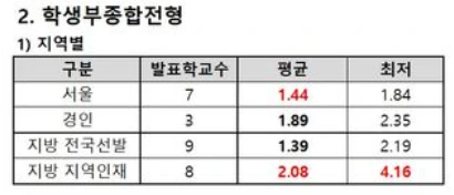 상위 70% 수준(그림에는 최저로 표현되었지만 백분위 70%가 맞다)도 각각 1.37, 1.51로 지역인재 전형이 더 유리하다. 학생부종합전형 결과도 이와 유사하다.