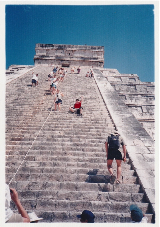 피라미드로 올라가는 계단은 가파르다. 30미터를 오르기 위해서는 네 발로 걸어야 한다. 어진간한 강심장도 직립보행으로 계단을 오를 수 없을 것이다. 특히 피라미드 등반 도중 아래를 내려본다면 더욱 그럴 것이다. 사람들은 피라미드 꼭대기에서 시작하여 바닥까지 이어진 두꺼운 동아줄을 생명줄처럼 잡고 오른다. 나도 그 대열에 합류한다.