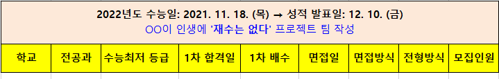 이렇게 정리하니 지원학교, 지원학과, 수능 최저 등급 여부, 1차 합격일 등 앞으로 필요한 정보가 한눈에 보인다.