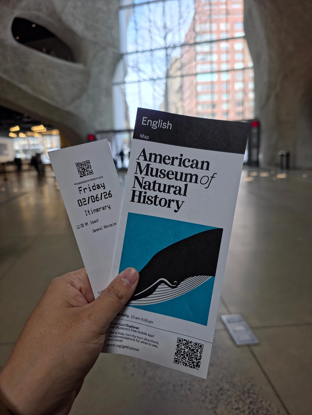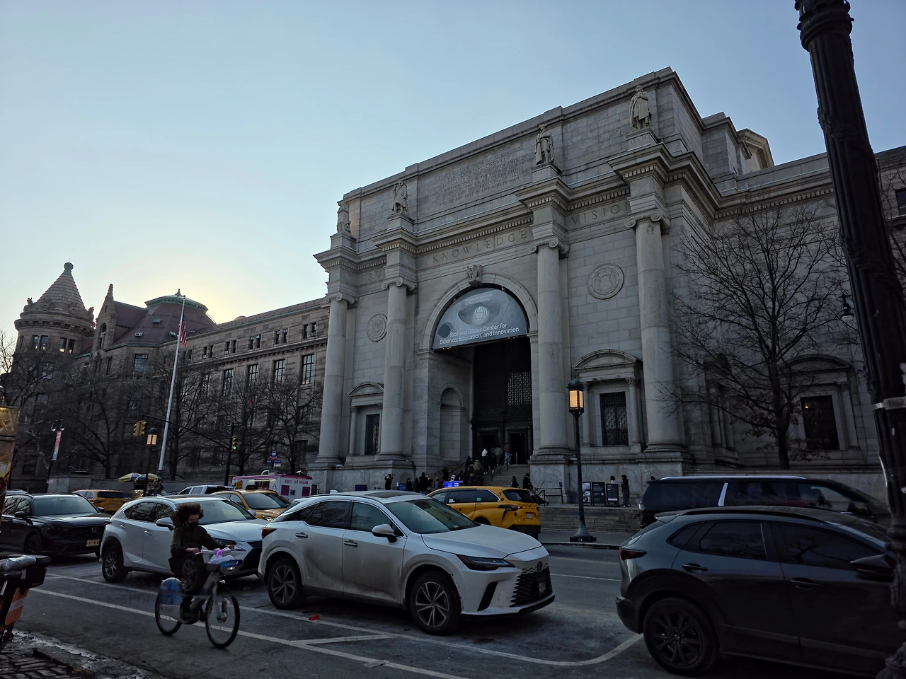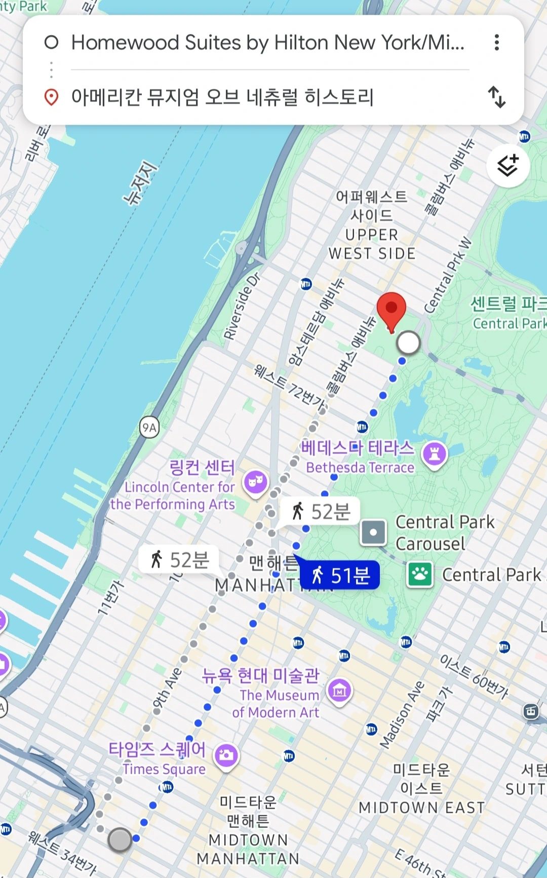 뉴욕 자연사 박물관은 정말 꼭 가봐야 겠다고 생각했던 곳인데 그날이 현실로 다가오다니 정말 흥분되고 즐거웠다. 호텔에서 박물관 까지는 대략 50분 정도 걸리는 거리였는데 뉴욕이라는 도시를 제대로 즐기기 위해서는 걷는게 좋다 라고 생각했다. 위 구글맵의 경로말고 우리는 타임스퀘어를 가로질러 가는 루트를 선택했다. 중간에 커피도 한잔 테이크아웃 하고 살살 마시면서 걸어갔다.