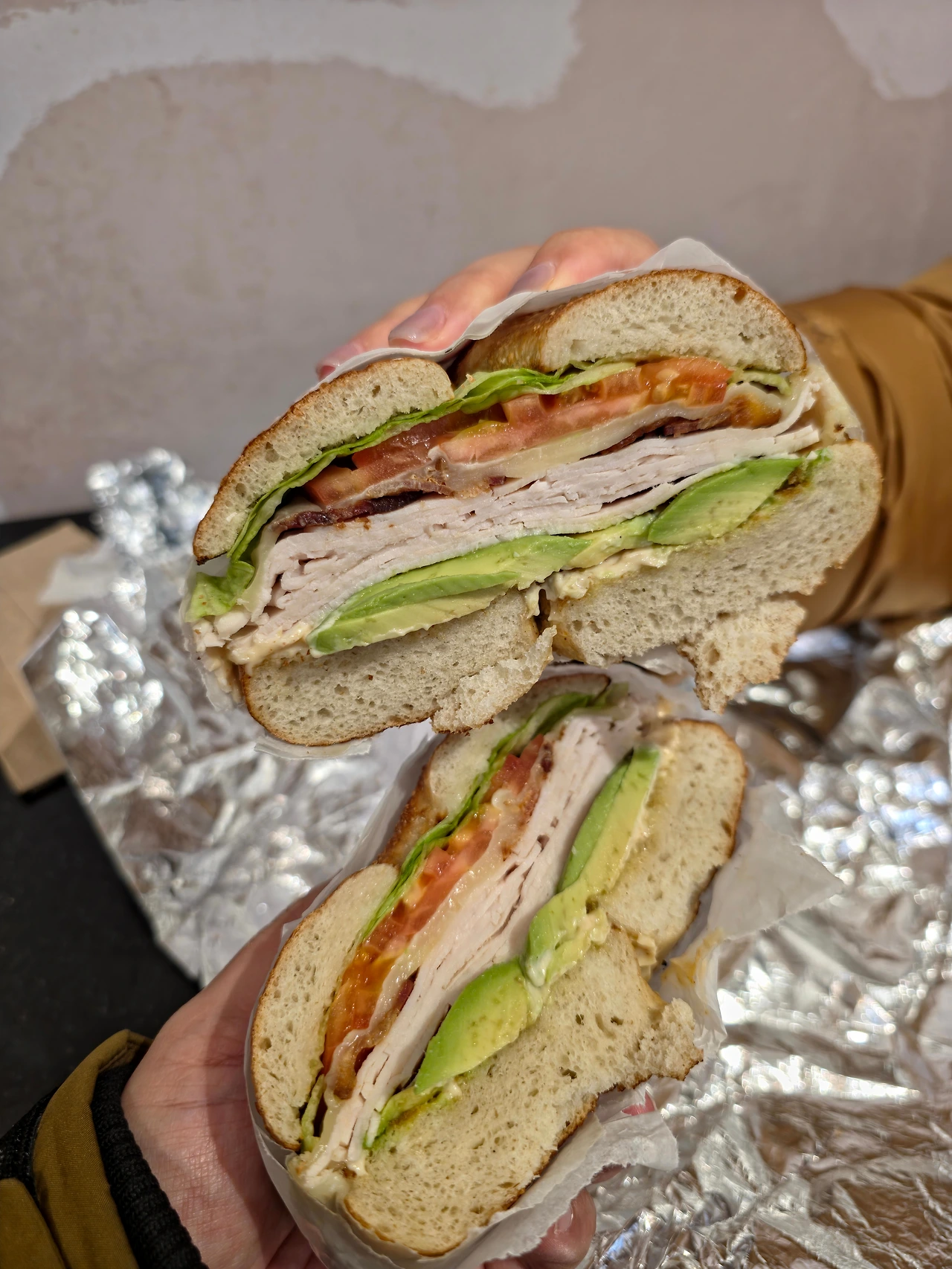 오늘은 숙소앞에 있는 베이글집에서 아침을 먹었다. 매일 호텔조식을 먹다보니 좀 질렸기 때문이기도 한데, 겸사겸사 미국의 베이글 맛도 좀 보자! 한것도 있기 때문이다. 이 가게는 사람들 추천 맛집은 아니었는데 출근하는 현지인들이 많이 오가는 가게인 만큼 맛은 보장돼 있을거라 생각했다. 저 메뉴 이름이 ‘THE BOMB'이었던걸로 기억하는데 메뉴이름에 어울릴 정도의 비주얼을 자랑했다. 엄청 두껍고 신선한 비주얼에 베이글 자체도 맛이 엄청좋았다 (이후 귀국하는 날 아침까지 여기서 사먹었다)