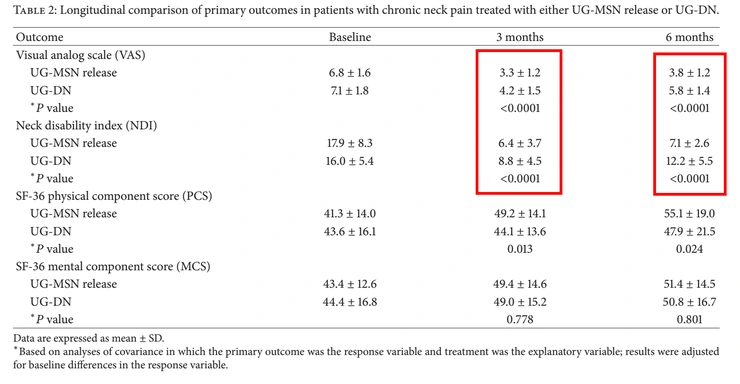 치료는 주 1회씩 진행되었고, 총 3주간 실시되었습니다. 즉 총 3회의 치료를 통해서 통증이 어떻게 변화가 되는지, 그리고 치료 후 3개월, 6개월 다시 환자를 평가하여 목의 통증이 얼마나 남아있는지 확인하였습니다.