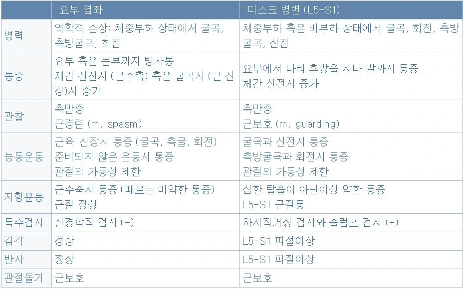 위의 도표를 보자. 이 역시도 같은 책에 나와있는 내용이다. 둘이 너무 비슷하지 않은가? 둘 모두 체간을 굴곡하거나 신전할 때에 통증이 있으며, 요추의 가동성 제한이 발생하게 된다. 보호성 기전으로 인해서 일시적인 측만증이 나타날 수도 있다. 저항 운동을 통해서 통증이 적당히 혹은 약하게 있는 것까지도 비슷하다