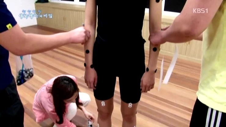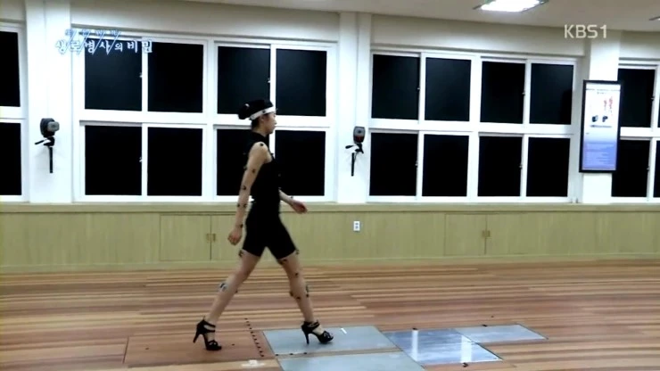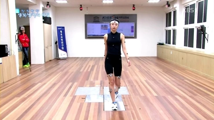그래서 다시한번 근육의 활성도에 대해서 실험을 하였습니다 . 먼저 온 몸에 근육의 전기적 활성도를 검사할 수 있는 전극을 붙이고 운동화를 신고 걷게 합니다.