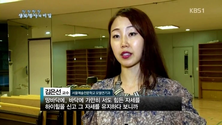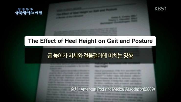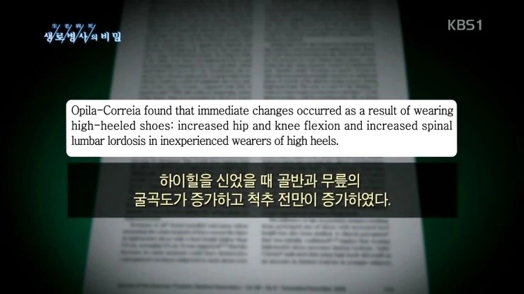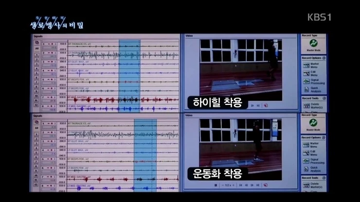 이런 내용들은 제가 이전에 KBS 생로병사의 비밀 작가분들과 함께 2013년 10월 '척추 균형이 생명이다' 편에서 하이힐의 문제에 대해서 설명을 하면서 같이 준비했던 자료인데요, 방송에서는 직접 모델들에게 근전도 실험을 하기도 하였고, 위의 내용을 안내해주기도 하였습니다.