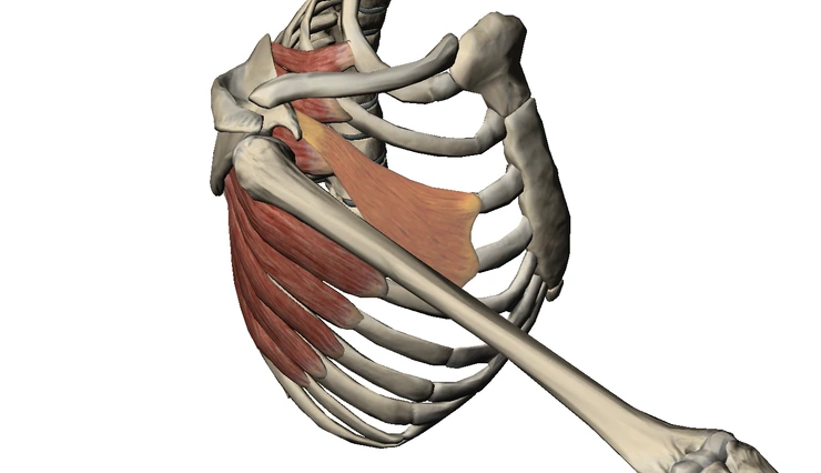 견갑골의 앞쪽으로는 (rib과 scapular 사이)에는 견갑하근과 전거근이 있습니다. 전거근은 늑골에서 기시하여 견갑골의 앞쪽면에 부착하게 되고, 견갑하근은 견갑골 앞쪽면에 존재합니다. 견갑하근과 전거근은 늑골과 견갑골 사이에서 일종의 쿠션역활을 하는데, 둘 사이의 근육으로 만들어진 공간이 일종의 관절을 이루게 됩니다. 이를 Scapulorthoracic articulation이라고 합니다. 이름 그대로 견갑골과 흉부 사이의 관절이라는 뜻인데요, 근육으로 이루어진 가상의 관절입니다. 주로 이 사이에 움직임이 문제가 생겨서 어깨를 움직일때 소리가나고 통증이 있게 됩니다.