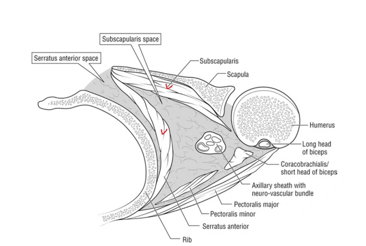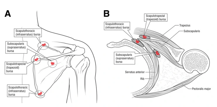 견갑골에는 부드러운 움직임을 위해서 여러군데에 점액낭이 존재합니다. 점액낭은 미끌미끌한 재질의 주머니로 주변 조직의 움직임을 부드럽게 기름칠해주고 윤활유의 역활을 하는 조직입니다. 견갑골에서 주된 점액낭은 전거근과 흉벽사이에 있는 infraserratus bursa(intraserratus bursa의 경우 견갑골의 위쪽 끝과 아래쪽 끝 2군데에 존재한다)와 전거근과 견갑하근 사이에 있는 supraserratus bursa가 되겠습니다.