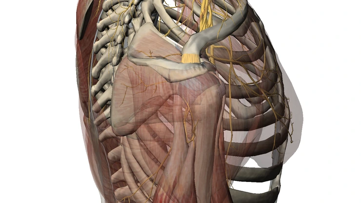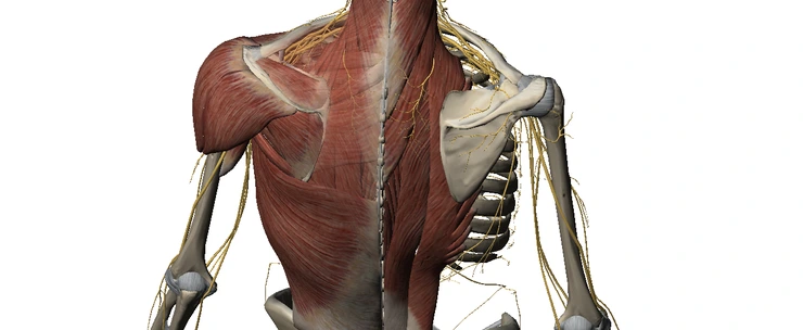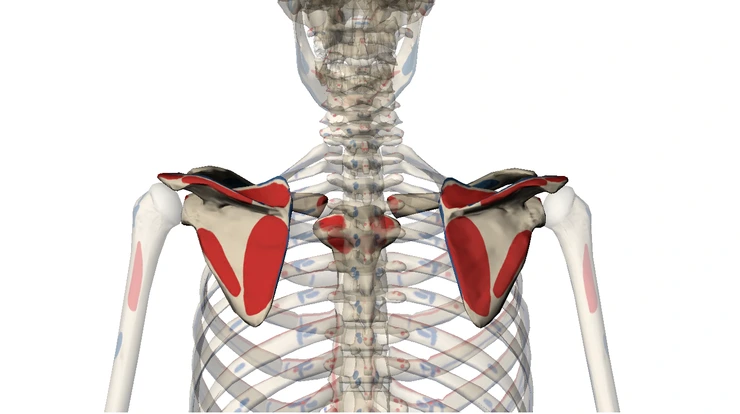 주변 조직과의 연결의 해답은 근육에 있었습니다. 위의 사진에서 처럼 수 많은 근육들이 견갑골의 앞뒤옆에 존재하여 견갑골이 흉부에 붙어있도록 합니다. 이 근육들은 견갑골이 안정적으로 해부학적 위치를 지키고, 다양한 움직임을 하도록 도와줍니다. 견갑골의 내측으로는 견갑거근과 능형근이 있습니다. 이 두 근육은 흉추에 견갑골을 연결합니다.