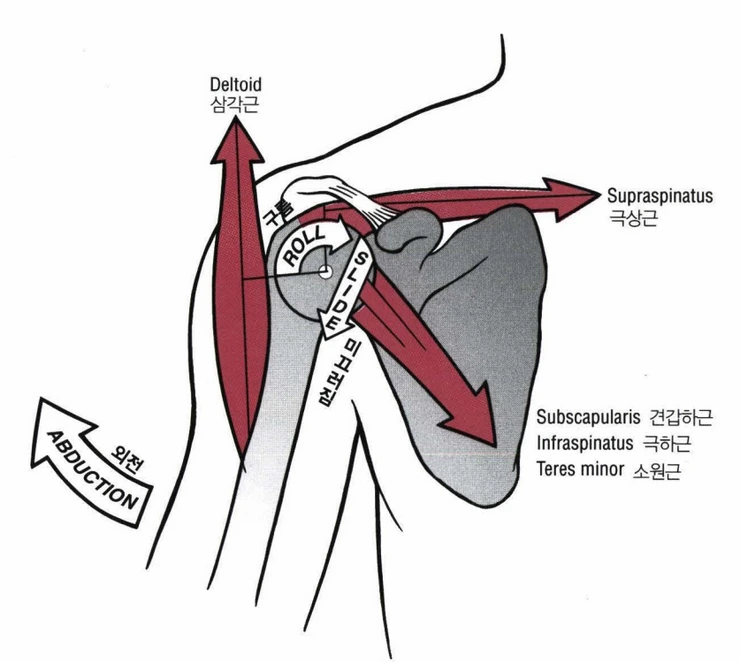 견관절의 관절면은 공중에 떠 있는 형태여서 주변 근육의 도움을 많이 받아야만 안정화됩니다. 이를 회전근개라고 하는데, 이 회전근개의 수축에 의해서 관절이 조여지면서 관절에 안정성을 부여합니다. 이런 것을 Dynamic stabilization이라고 하지요. 그런데 근육의 손상으로 인해 이 움직임에 제한이 생기는 경우가 있습니다.