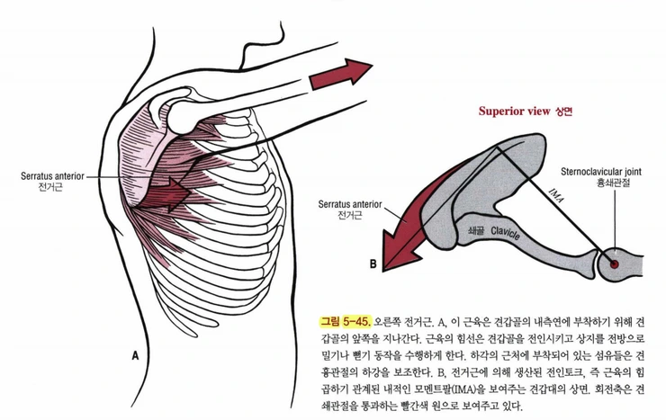 전거근은 비대가 있어서 전거근과 견갑하근 사이의 공간이 줄어들거나, 근육이 섬유화되어 거친면을 가지게 되어 견갑골의 움직임시 마찰이 생기면 소리가 나고 통증이 생깁니다. 전거근은 견흉관절을 전인시키는데 거의 유일하면서 가장 큰 역활을 하기 때문에 전거근의 이상도 확인하여야 합니다.