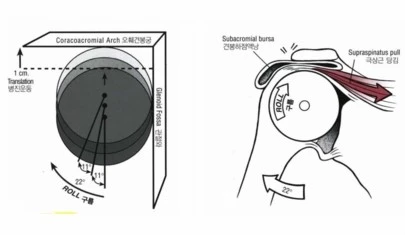 이를 정확히 살펴보면 약 22도 정도의 외전은 1cm 정도 상완골두를 상승시키게 됩니다. 이 과정에서 상완골두를 내리기 위한 안정화 기전이 일어나지 않는다면 견봉하 공간이 좁아지고 충돌이 일어나게 됩니다. 즉 우리 몸에서는 어깨를 들어올리면서 또 내리는 작업을 계속 하고 있는 것입니다. 상완골이 항상 그자리에 있게 하기 위해서이지요. 이런 작업을 상완골 회전 중심의 안정화라고 부릅니다.