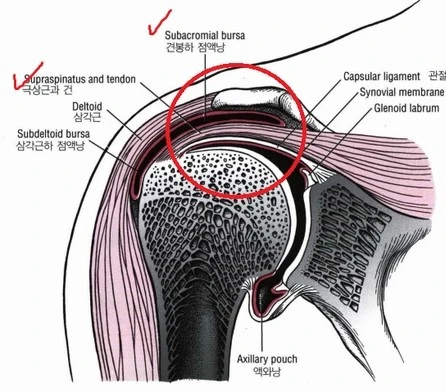 그런데 이렇게 상완골두가 위로 올라가는 것을 막지 못하면 이 부위에 있는 해부학적 조직들이 많은 손상을 받고 통증과 염증을 만들어 내게 됩니다.