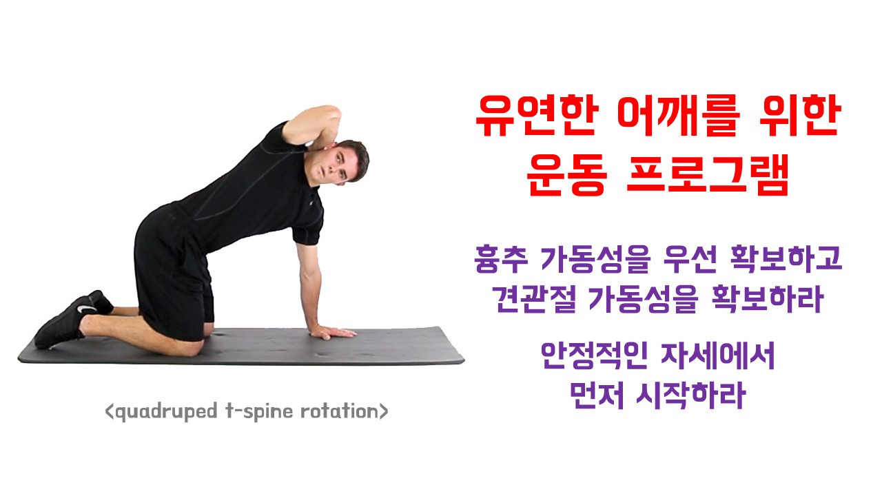 가동성 훈련은 흉추의 가동성을 회복하는 것부터 시작합니다. 척추 중에서 회전의 능력이 가장 좋은 척추분절은 흉추입니다. 특히 요추와 흉추의 이행부에서 가장 운동성이 큽니다. 그러나 매일 앉아서 컴퓨터 업무를 보고, 퇴근해서는 누워서 쉬면서 척추가 전반적으로 뻣뻣해지기 쉽습니다. 흉추가 뻣뻣해지면 그만큼 움직임이 부족한 부분을 누군가는 채워야 합니다. 그리고 그 피해자는 어깨가 되기 쉽습니다. 그래서 흉추의 가동성 회복부터 시작합니다.