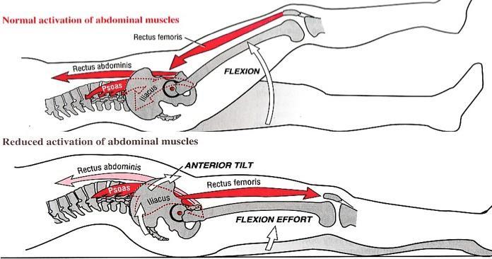 복부에서 충분히 골반의 후방경사를 지지해주지 못 하면, 골반은 전방경사가 만들어지고 그 결과 허리를 과신전되게 됩니다. 간단히 말해서 위의 그림처럼 바로 누웠을 때에 허리가 공중에서 붕 뜨게 된다는 것인데요, 이 상태를 교정하는 것이 첫번째 운동입니다. 최대한 편안하게 무리가 되지 않는 범위 내에서 요추를 평평하게 바닥에 붙일 수 있도록 노력합시다.