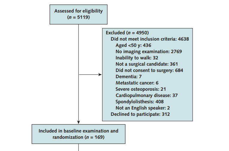 이 논문의 실험 대상군은 이미 수술을 권유 받은 요추 척추관 협착증 환자를 대상으로 합니다. 초기에는 총 5119명이 모집되었지만, 나이가 너무 젊거나, 수술을 받을 정도의 체력적 상태, 심혈관계 상태 등이 부족하거나, 혹은 수술의 권유대상이 아닌 경우에는 제외되었습니다. 그리고 최종적으로는 169명이 남았습니다. 그리고 무작위로 수술군과 비수술군으로 나뉘게 되었지요.