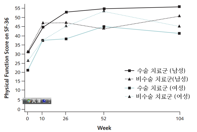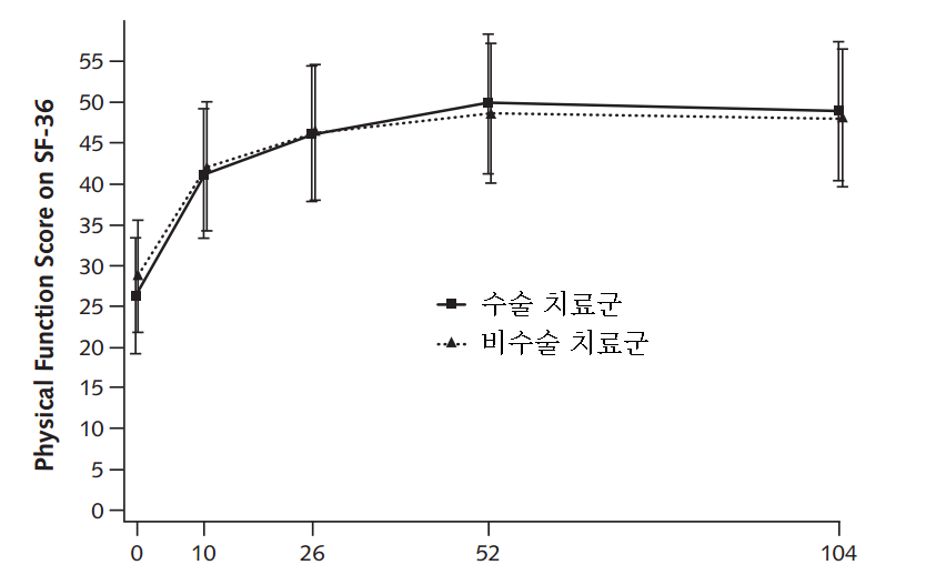 그 치료 결과는 어땠을까요? 수술치료군에서의 신체기능의 회복은 약 22.4점 정도였고, 비수술치료군에서는 19.2점 정도의 회복이 있었습니다. 둘 사이에서 통계적 유의점을 찾지 못했다는 것이 최종의 결과였습니다. (P > 0.50) 즉, 수술과 비수술치료의 차이가 거의 없었다는 것입니다.
