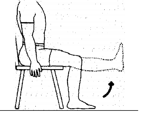 하지의 주된 근육인 대퇴사두근 역시 빠질 수는 없습니다. 앉은 상태에서 완전히 슬관절이 신전될 때까지 20회 3세트를 반복하도록 합니다. 통증이 심해지면 잠시 휴식을 취하도록 합니다. 난이도가 쉽다면 발목과 의자다리 사이에 밴드를 연결하여 저항을 주도록 합니다.