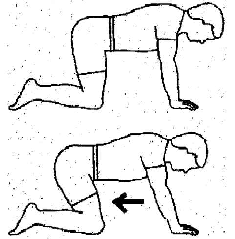 다음은 네발기기 자세에서 허리를 후방으로 보내는 운동입니다. 골반의 후방경사가 잘 유지되고 있는지 반드시 확인하면서 운동하도록 합니다. 호흡의 문제 없이, 골반의 경사가 유지되면서, 10초간 20회 운동할 수 있다면 다음으로 넘어가도록 합니다.