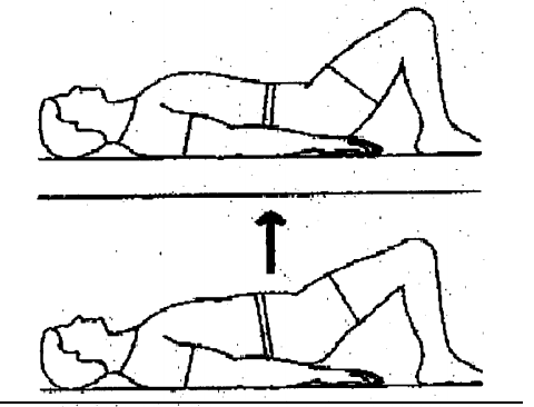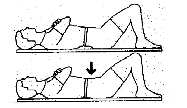 환자는 바로 누운 상태에서 무릎을 굽혀서 바닥을 지지합니다. 그리고 척추를 굴곡 시켜서 바닥면에 척추를 닿게 하는 운동입니다. 총 10회 반복하며 한 번에 20초씩 수행합니다.