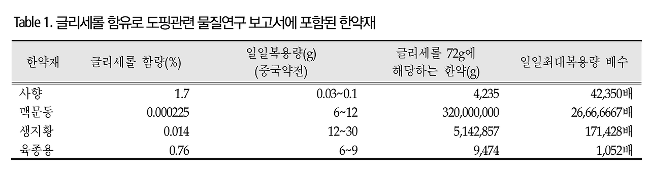 맥문동, 사향, 생지황, 육종용 - 이뇨제이자 은폐제인 글리세롤 주사제 때문입니다. 한약 먹어서 넘으려면 1일 최대 복용량의 최소 100배부터 2000천만배 이상 복용해야합니다. 가능성이 없습니다.