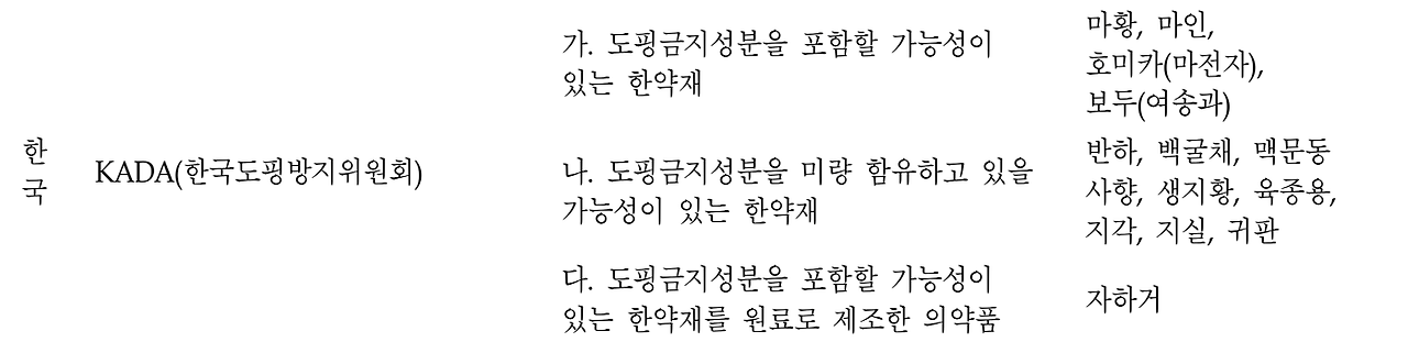 우리나라도 2007년 한국도핑방지위원회 (KADA)가 설립되어 한약을 포함한 도핑에 관련된 약물 자료를 제공하고 있습니다.