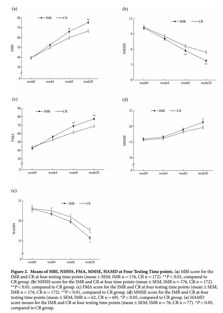그리고 평가의 지표 역시 MBI, NIHSS, FMA, MMSE, HAMD 등 다양한 지표로 평가되었습니다. 사실 이게 하나 지표 평가하는데 마다 시간이 오래 걸리기 마련이라서 더욱 감사한 자료입니다.